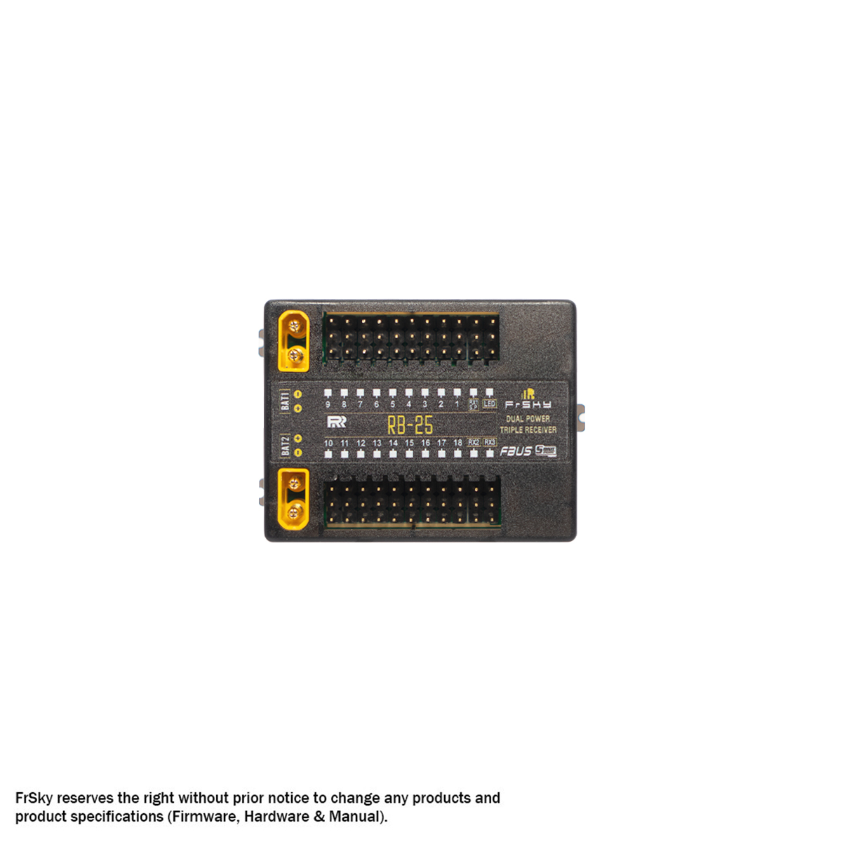 El RB-25/RB-25S ha sido diseñado para ofrecer redundancia de triple receptor y doble alimentación. Esto proporciona al usuario triple señal de receptor y redundancia de telemetría mediante la incorporación de puertos multiplex (RX1-3 IN / S.Port). La doble alimentación proporciona una forma segura y eficiente de alimentar el sistema con las fuentes de alimentación conectadas a través de un par de conexiones XT30 estándar. El sistema de doble consumo de energía está diseñado para funcionar en modo de equilibrio, donde consume la línea de alimentación de cualquiera de las fuentes de alimentación, dependiendo de cuál tenga el voltaje más alto.