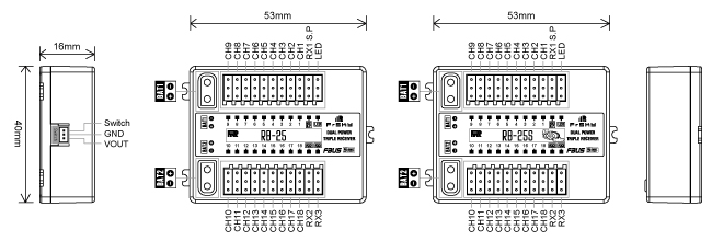 El RB-25/RB-25S también funciona como un módulo de sensores extenso con varios sensores integrados, incluida la telemetría diversificada. El RB-25S también incluye el sensor de telemetría de alta precisión para monitorear la altitud, la velocidad vertical, etc. También se puede utilizar como una alternativa al uso de un receptor de la serie GR o S.